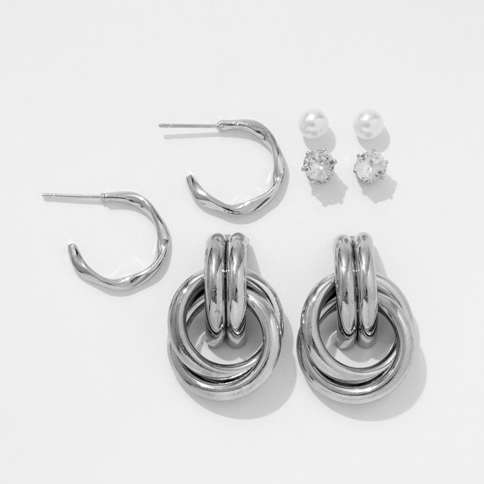 Набор серег QF «Летние истории», 4 пары, кольца и плетение, цвет белый в серебре