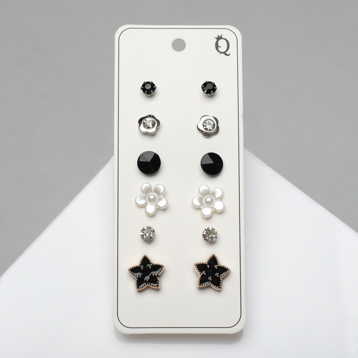 Серьги пусеты QF «Романтика», 6 пар, цветочки, чёрно-белый в серебре