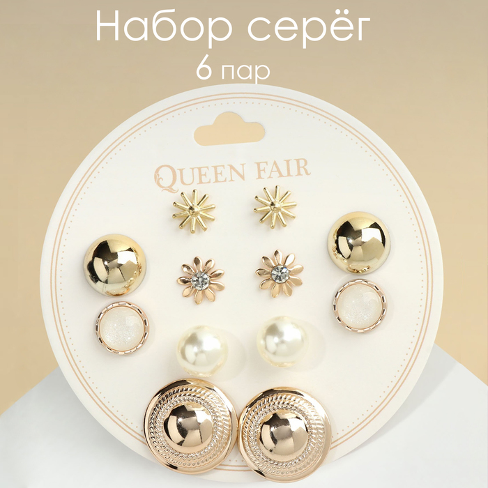 Серьги пусеты 6 пар «Жемчужные» планеты и цветы, белые в золоте