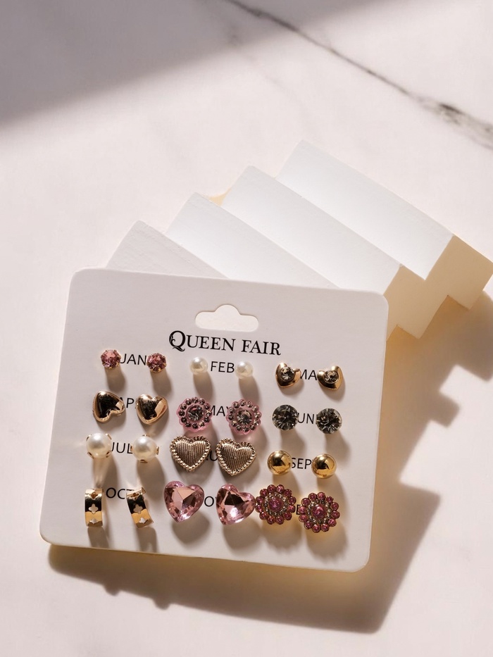 Серьги пусеты 12 пар «Фантазия» сердца, бело-розовый в золоте