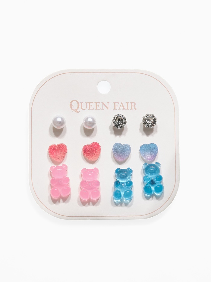 Серьги пусеты QF «Ассорти», 6 пар, мишки и сердечки, розово-голубые в серебре