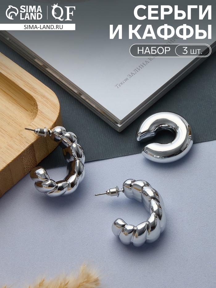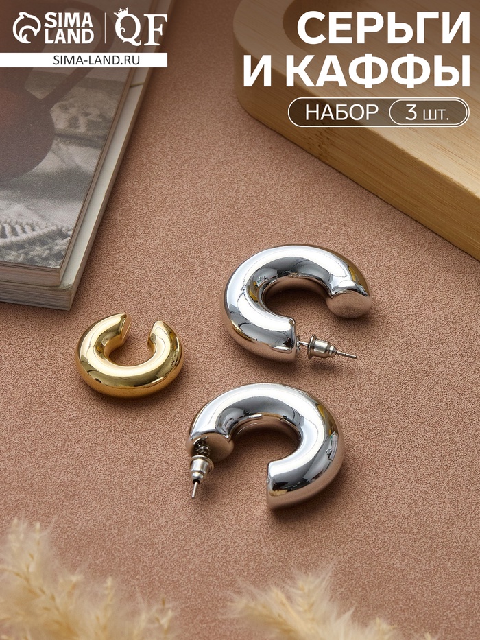 Серьги кольца и каффы QF «Бублик», набор, цвет золото, серебро