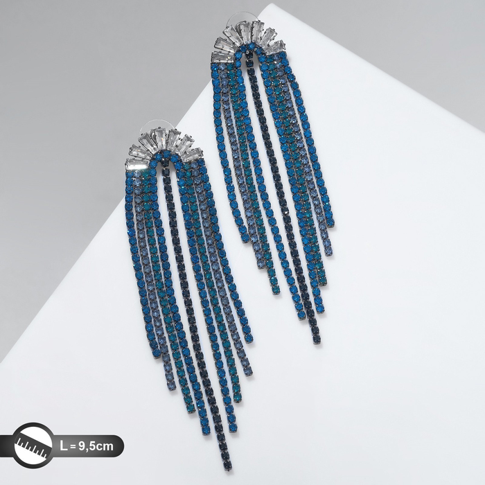 Серьги висячие со стразами «Водопад» веер, синие в сером металле, 9.5 см