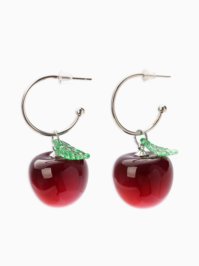 Серьги кольца «Черешня с листочком», бордовые в серебре