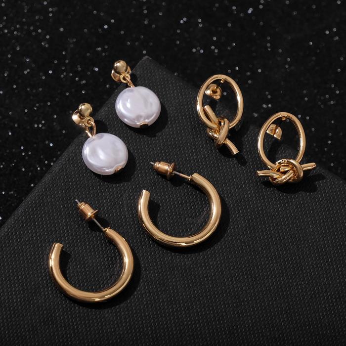 Серьги набор 3 пары «Юность» узел с жемчугом, цвет белый в золоте, d=2.3