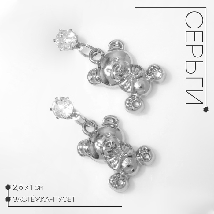 Серьги со стразами «Мишки» плюшевые с бантиками, белые в серебре