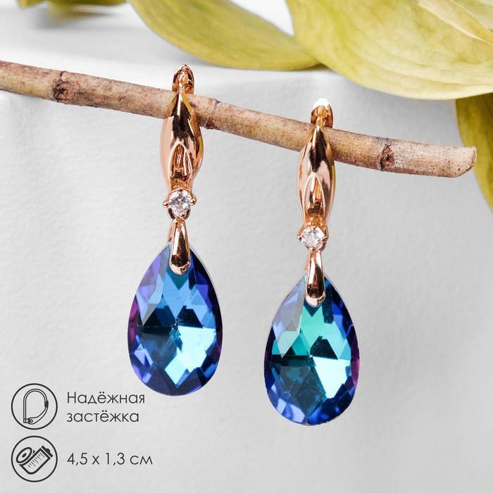 Серьги со стразами «Иллюзион» капля на овале, бело-синие в золоте