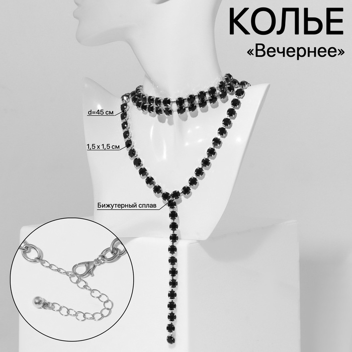 Колье «Вечернее» три ряда, чёрное в серебре, 45 см