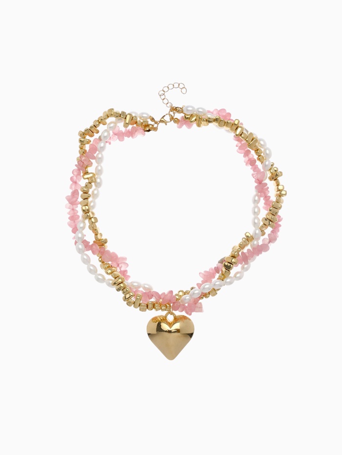 Колье «Акцент» сердце с жемчугом, многослойное, бело-розовое в золоте