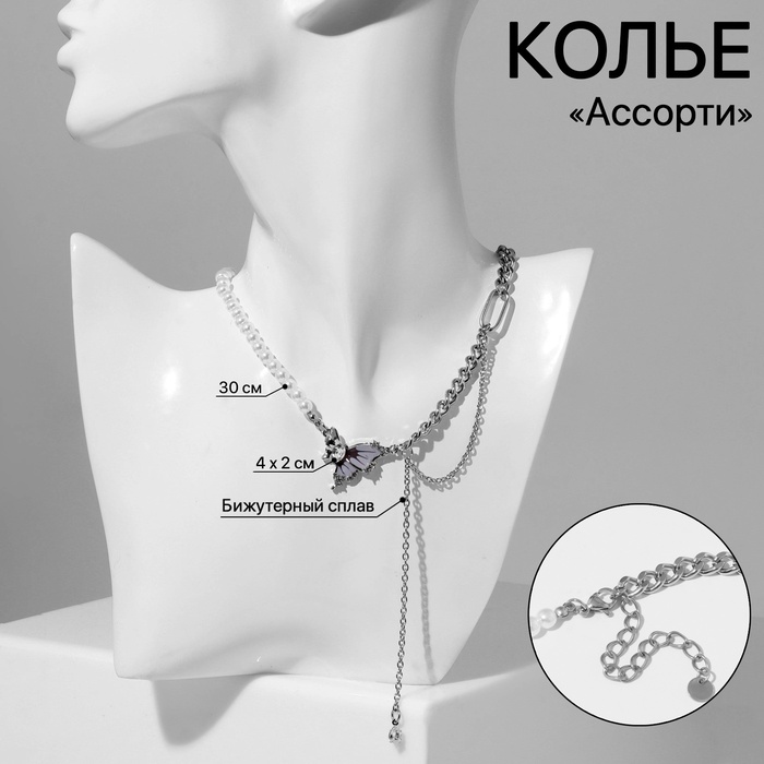Колье «Ассорти» жемчуг с цепочкой, белое в серебре, 30 см