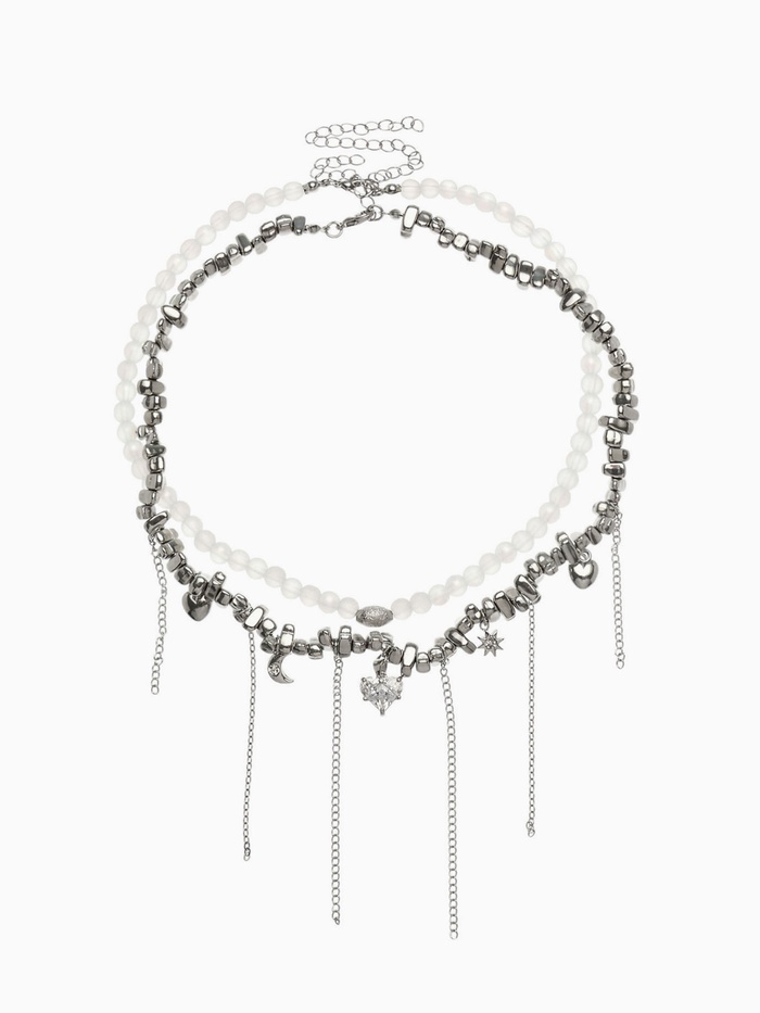 Колье «Акцент» сердце и луна, двойное, бело-серое в серебре
