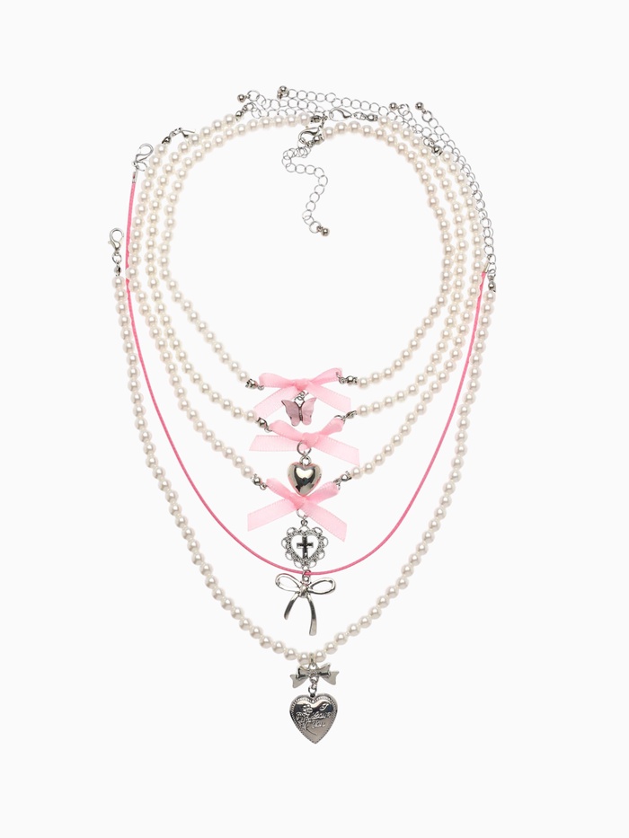 Колье «Бантик» набор 5 шт. бело-розовое в серебре