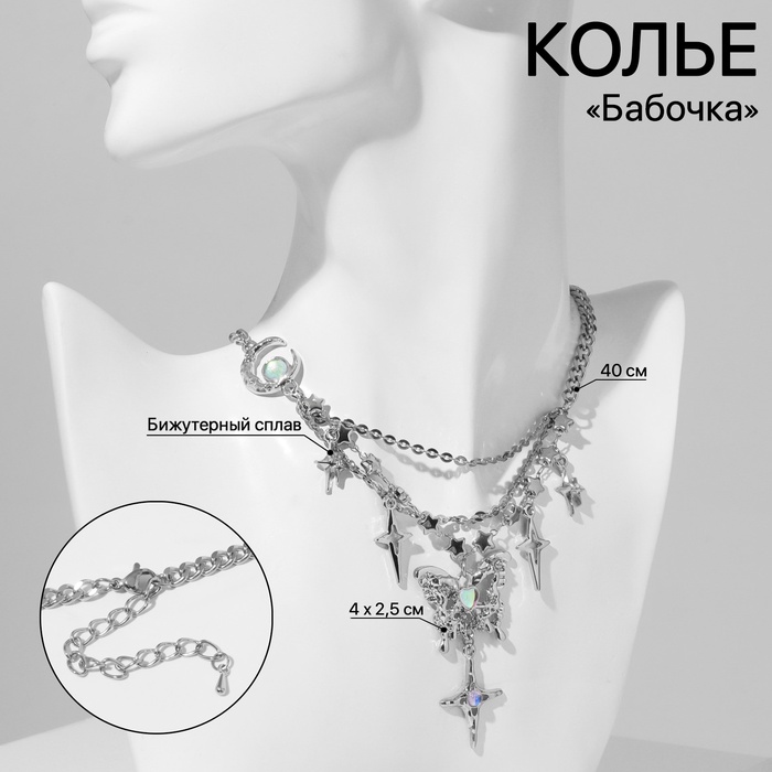 Колье «Бабочка» звёзды, белое в серебре, 40 см