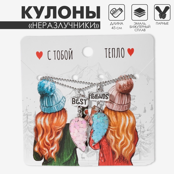 Кулоны парные на цепочке Best friends, 45 см, розовые, голубые в серебре