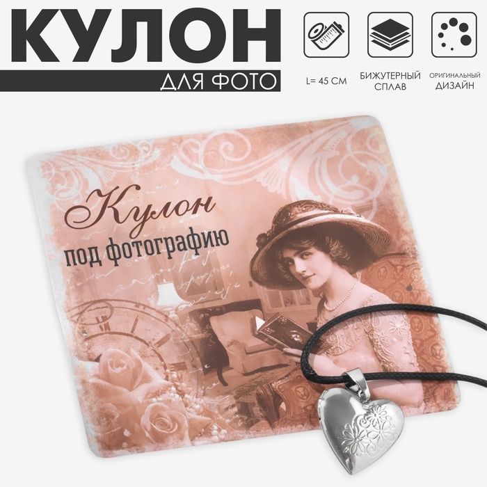Кулон для фото на шнурке «Сердце» с цветами, цвет чернёное серебро на чёрном шнурке, 45 с, м