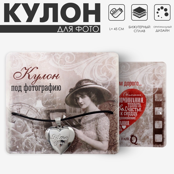 Кулон для фото на шнурке «Сердце» с надписью Love you, цвет серебро на чёрном шнурке, 45 см