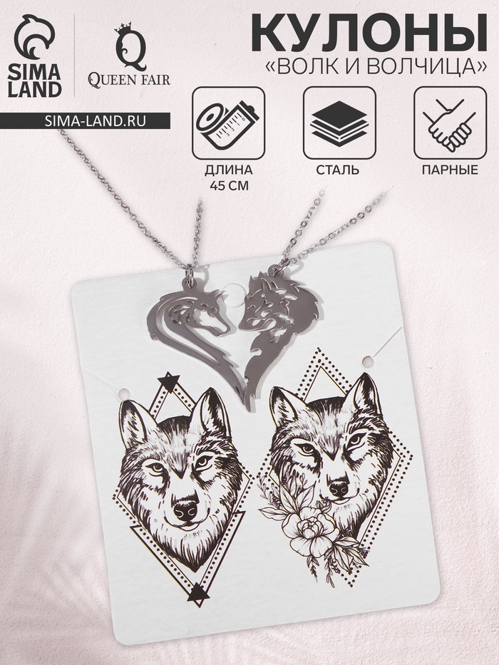 Кулоны парные на цепочке «Волк и волчица», цвет серебро, 45 см