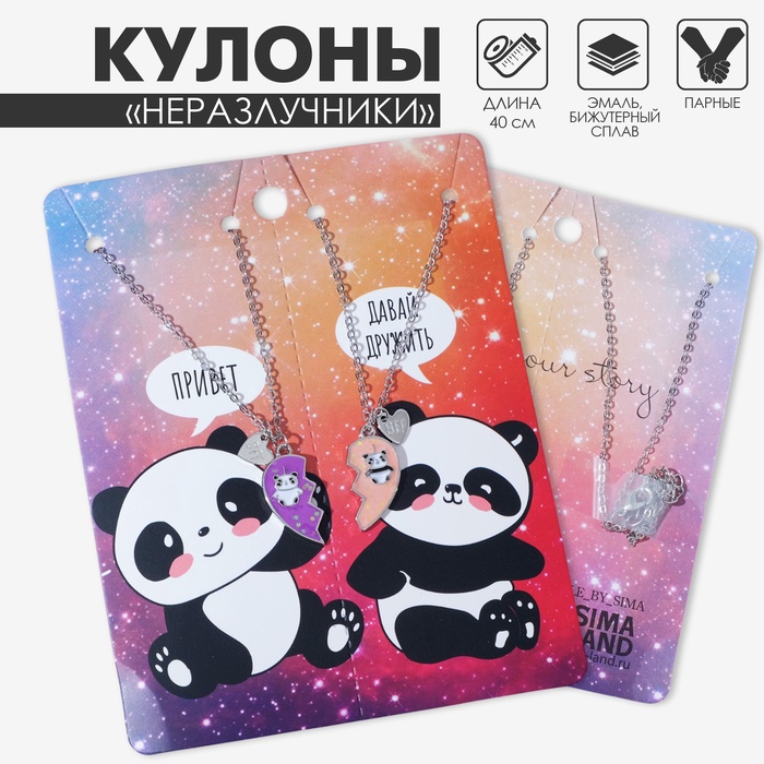 Кулоны «Неразлучники» панды в сердечке, цвет фиолетово-бежевый в серебре, 40 см