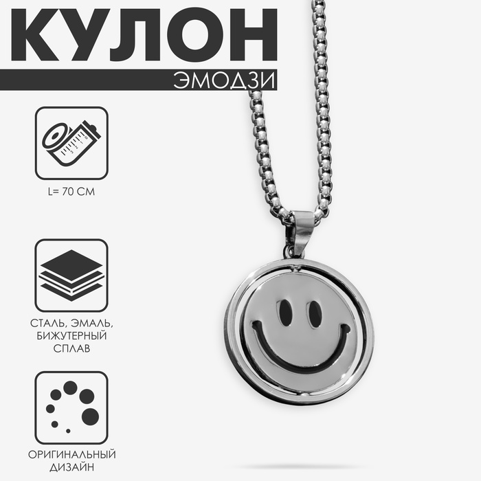 Кулон «Эмодзи» улыбка, цвет чёрный в серебре, 70 см