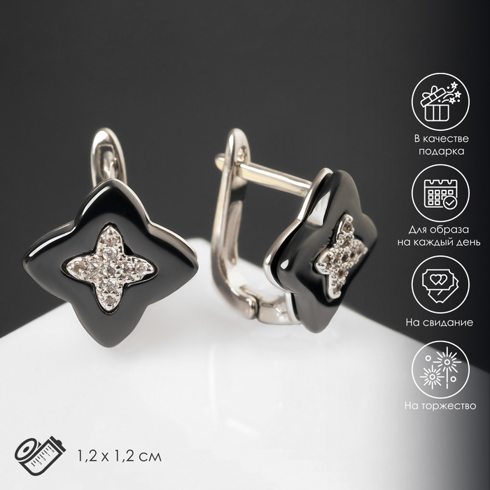 Серьги керамика «Цветок», чёрно-белые в серебре