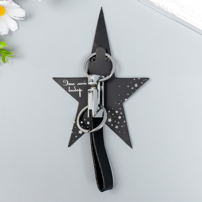 Брелок металл "Карабин стильный с ремешком и 2-мя кольцами" черный, серебро