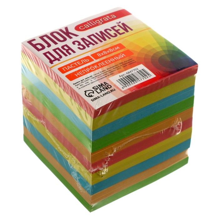Блок бумаги для записей Calligrata, 8×8×8 см, цветной, пастель, непроклеенный