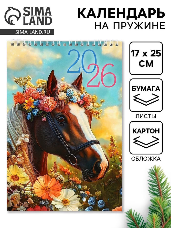Календарь 2026 на пружине без ригеля «Лошадь с цветами»