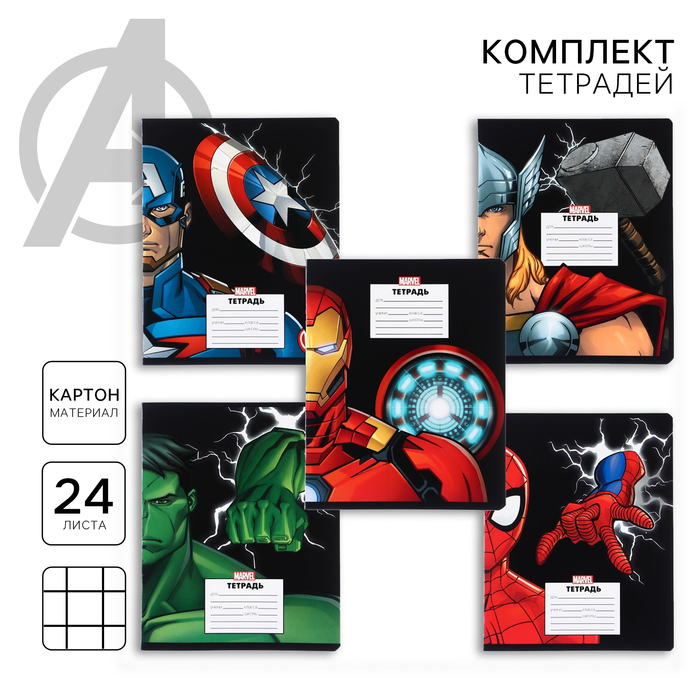 Тетрадь в клетку 24 листа, обложка мелованный картон, Мстители, 10 штук