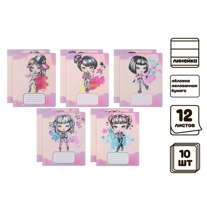 Набор тетрадей 12 листов в линейку Calligrata Pretty Girl, обложка мелованная бумага, серые листы, 10 шт.