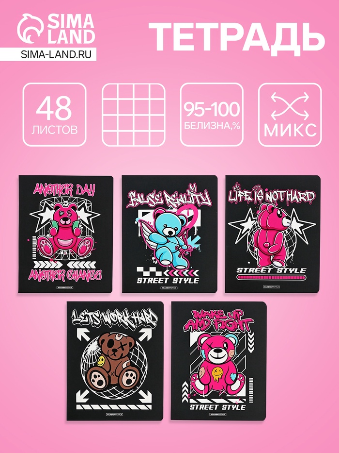 Тетрадь 48 листов, в клетку «Мишки-мотивашки», мелованный картон, МИКС