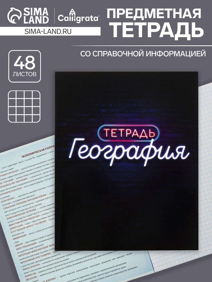 Тетрадь предметная 48 листов в клетку Calligrata, «Неон. География», со справочным материалом, обложка мелованный картон, УФ-лак, блок офсет
