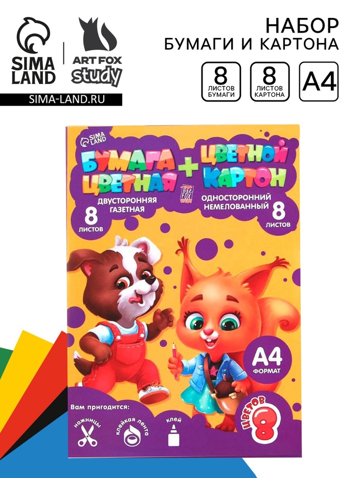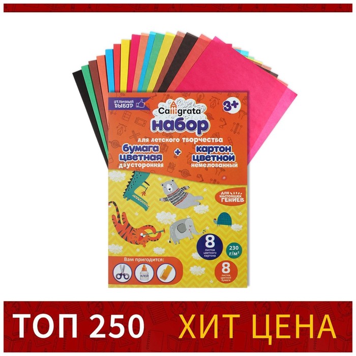 Набор А4 Calligrata, 8 листов, 8 цветов, немелованный картон и 8 листов, 8 цветов двухсторонняя бумага, в папке