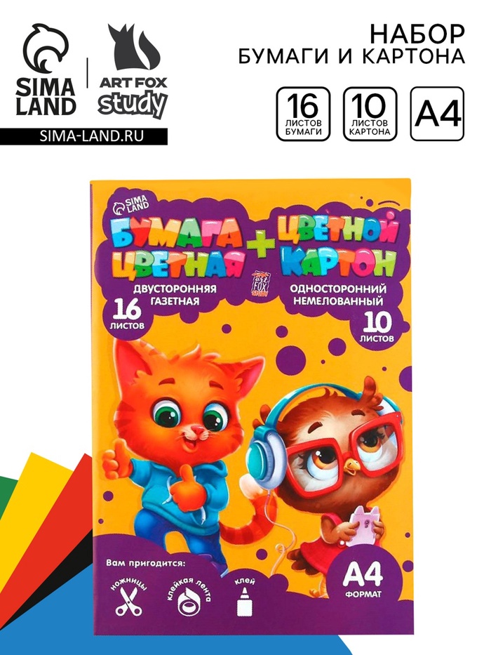 Набор для детского творчества А4, 10 листов картон цветной немелованный + 16 листов бумага цветная двусторонняя