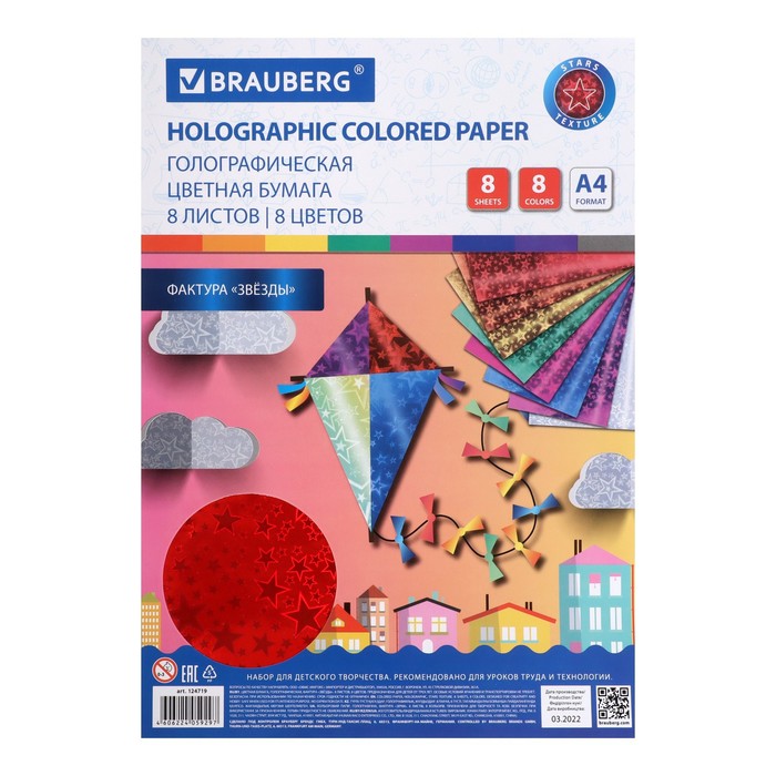 Бумага цветная голографическая А4, 8 листов, 8 цветов, рисунок из звезд, 210 х 297 мм