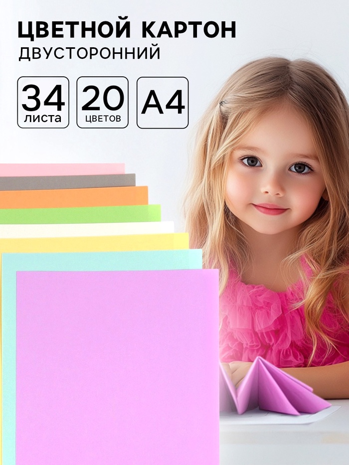 Цветной картон А4 тонированный, 34 листа, 20 цветов, 180 г/м