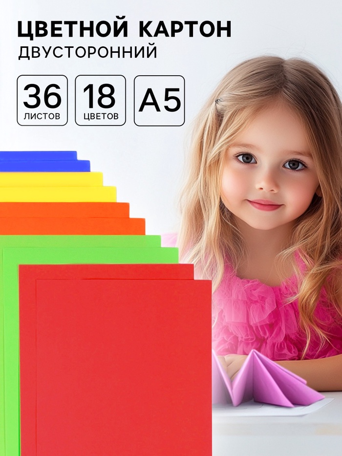Цветной картон, А5, 36 л., 18 цветов, немелованный, двусторонний, 180 г/м²