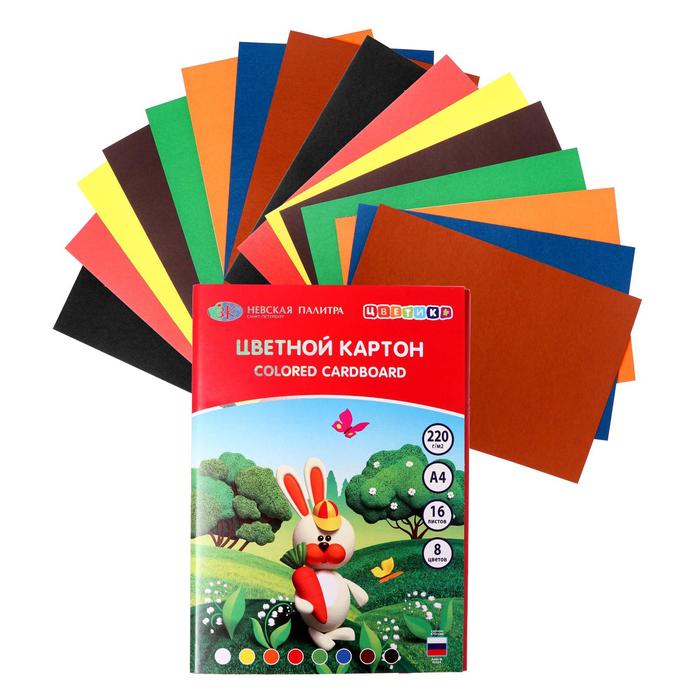 Картон цветной 16 листов, 8 цветов ЗХК "Цветик", 220 г/м2, односторонний, немелованный