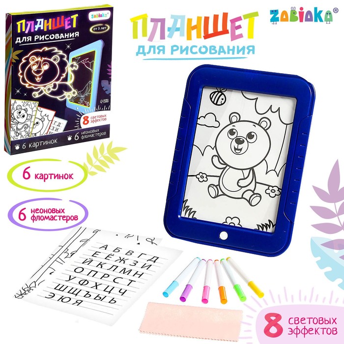 Планшет для рисования «Зверята», 6 неоновых фломастеров, 6 картинок, 8 световых эффектов