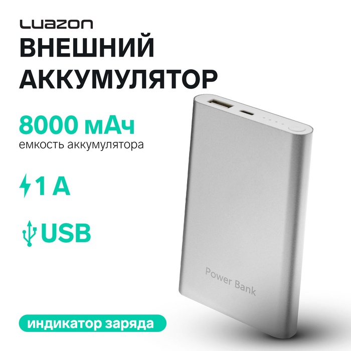 Внешний аккумулятор Luazon PB-24, 8000 мАч, USB, 1 А, индикатор, металл, серый