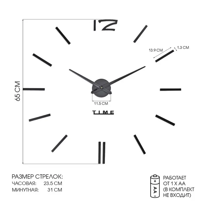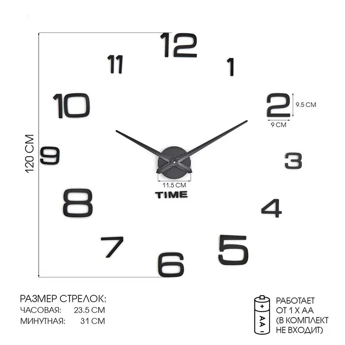 Часы настенные интерьерные, 3d, наклейка, большие, d=120 см, чёрные