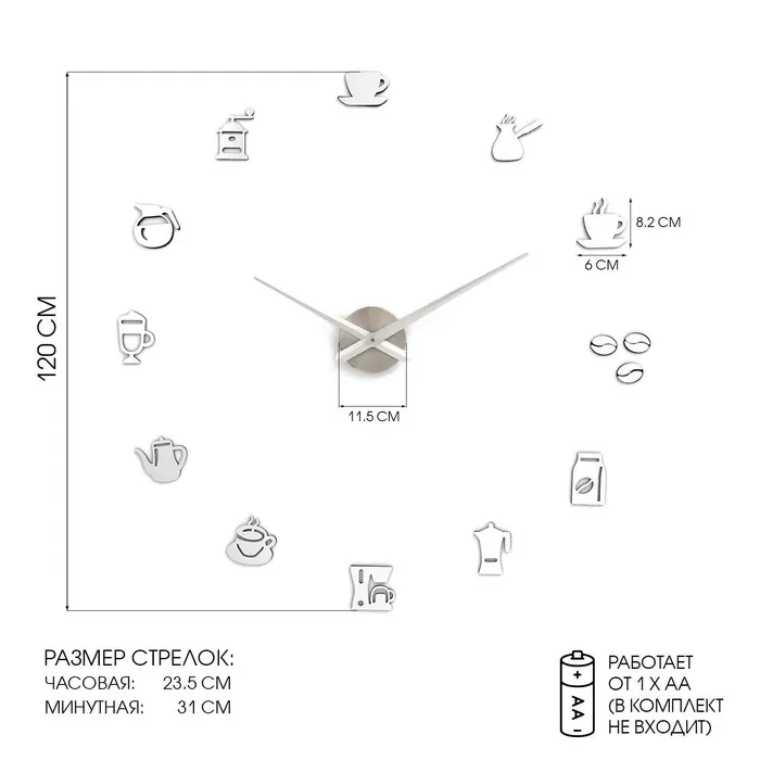 Часы настенные интерьерные большие для кухни, 3d "Время кофе", наклейка, d-120 см