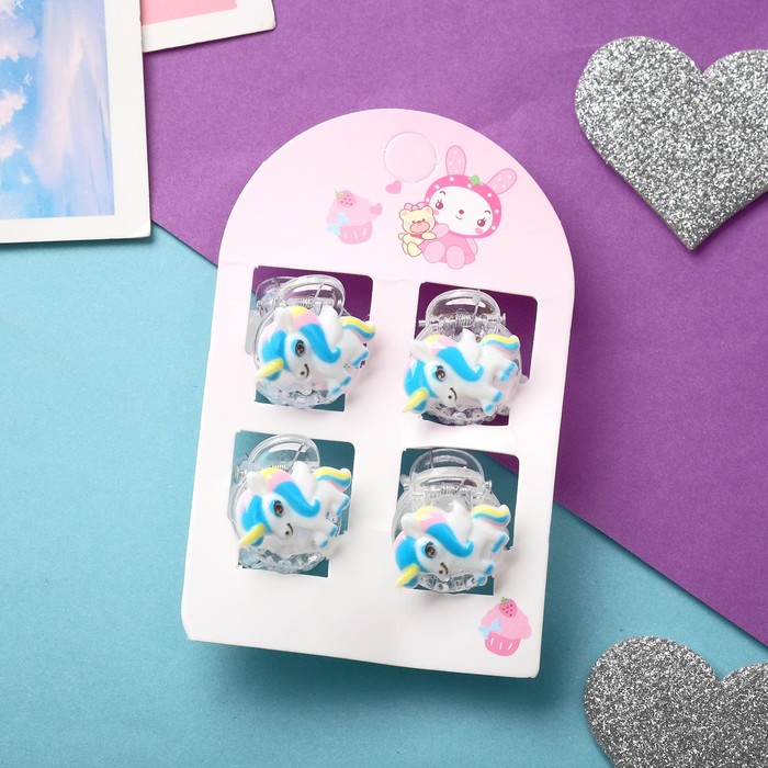Крабики для волос «Маленькая радость», набор 4 шт., единорожек, 2 см, бело-голубой