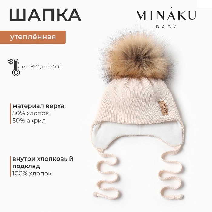 Шапка детская MINAKU с утеплителем, р-р 42-44, цвет молочный