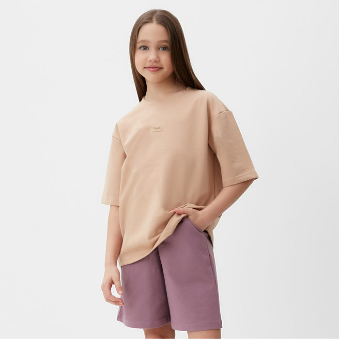 Костюм для девочки (футболка, шорты) MINAKU, бежевый/ пыльно-сиреневый, рост 134 см