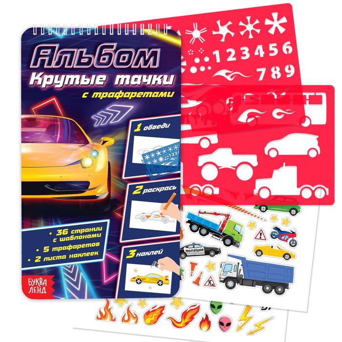 Раскраска - альбом «Крутые тачки», 72 стр., с наклейками и трафаретами