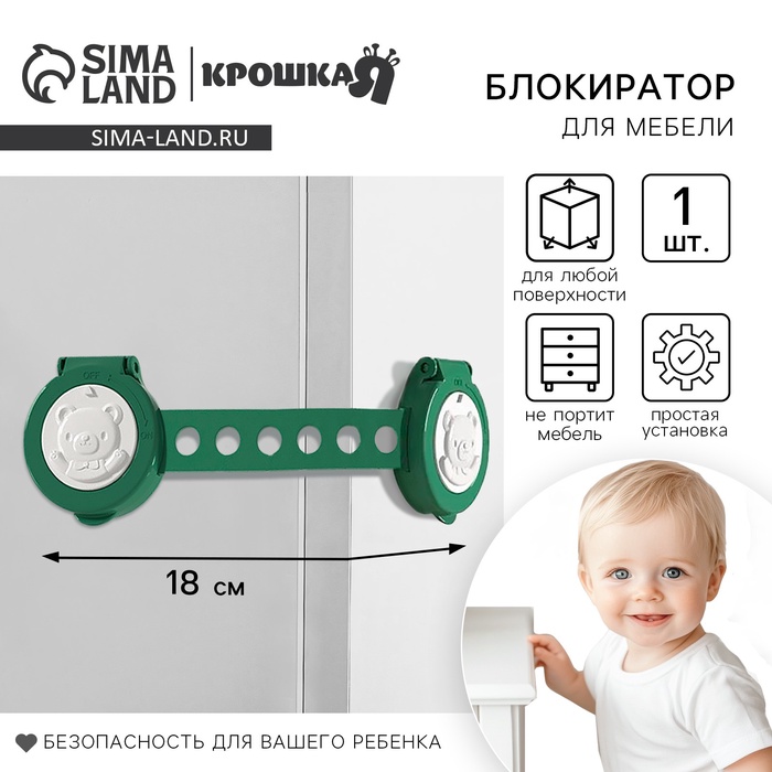 Блокиратор для дверей и ящиков Крошка Я «Мишка», универсальный, гибкий, зеленый