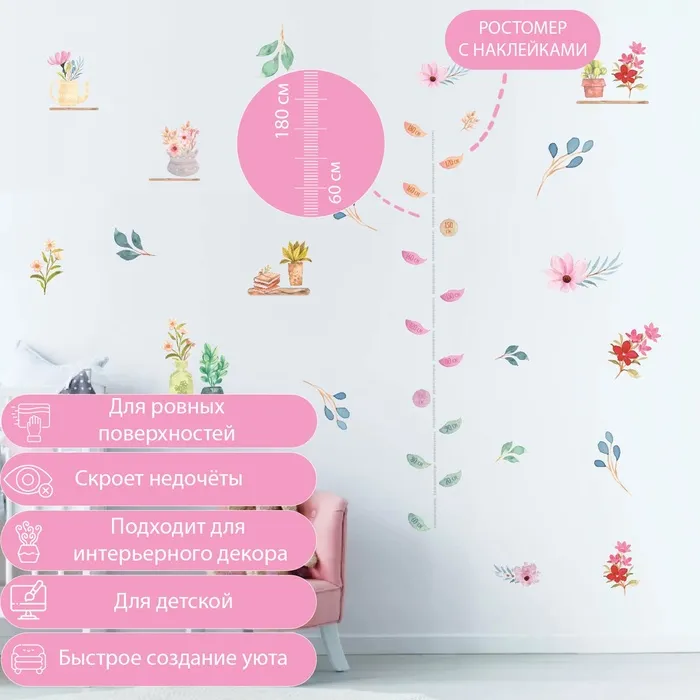 Наклейка интерьерная цветная ростомер "Цветы в горшочках" 50х70 см