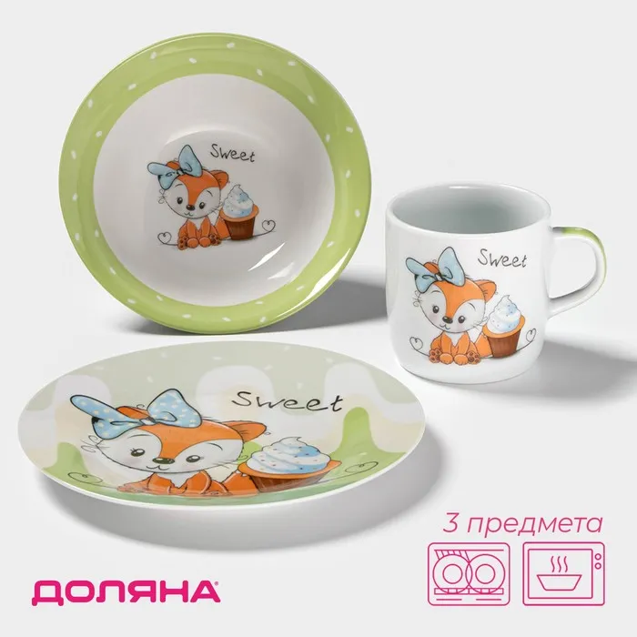 Набор детской посуды Доляна «Лисёнок», 3 предмета: кружка 230 мл, миска 400 мл, тарелка d=18 см, керамика, белый, зелёный