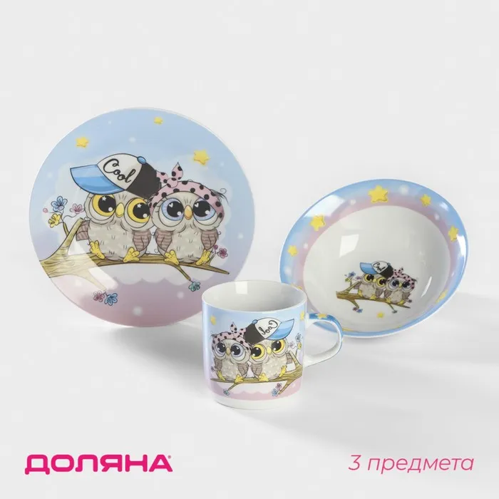 Набор детской посуды Доляна «Совы тинейджеры», 3 предмета: кружка 230 мл, миска 400 мл, тарелка d=18 см, керамика, белый, голубой