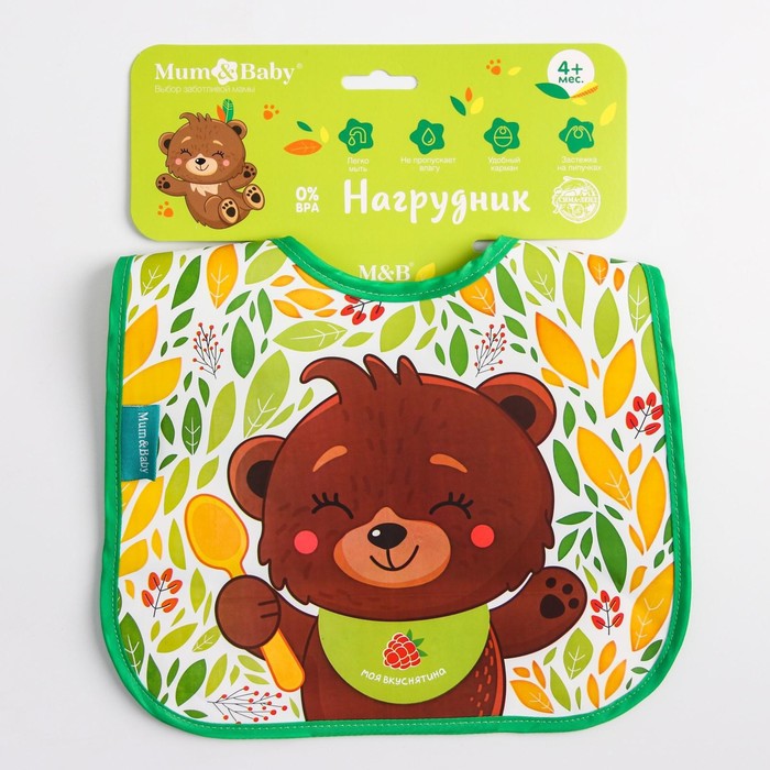 Нагрудник для кормления M&B «Мишка» непромокаемый на липучке, с карманом